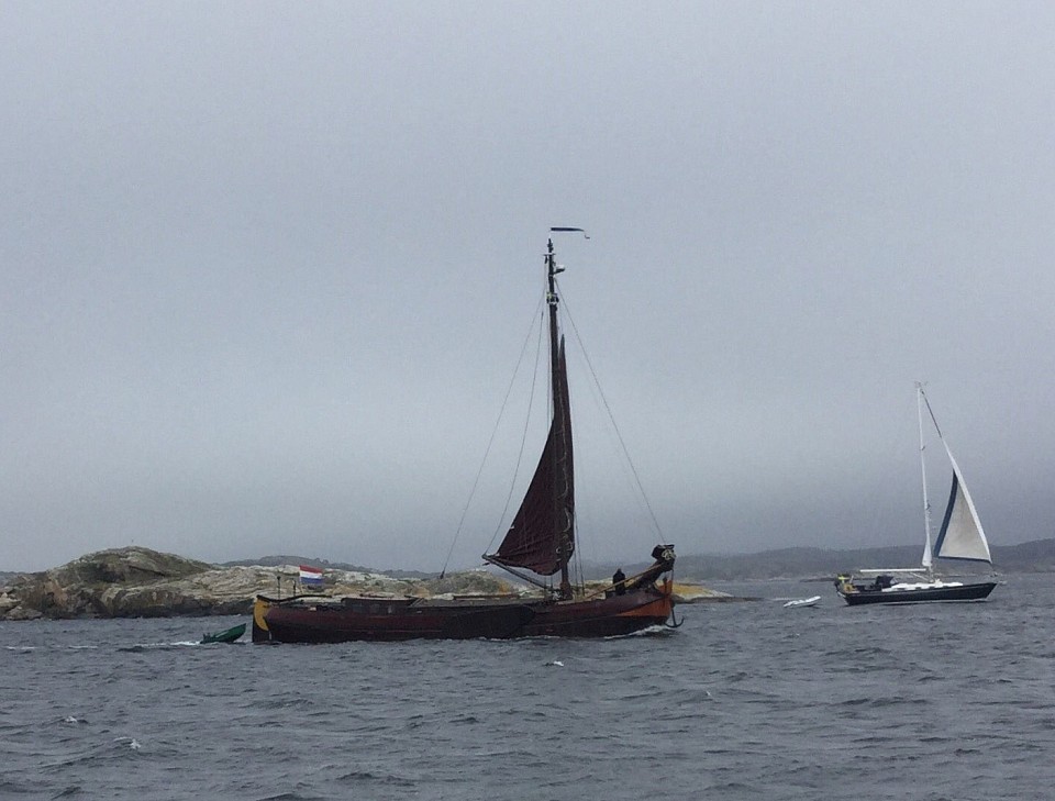 The weatherforecast showed uncertain wind strengths, and as usual the wind was stronger than forecast today. We measured over 32 knots so we're glad we had chosen not to sail offshore. On the way we passed the Dutch barge in the photo here, sailing at amazing speed into Elløs fjord.